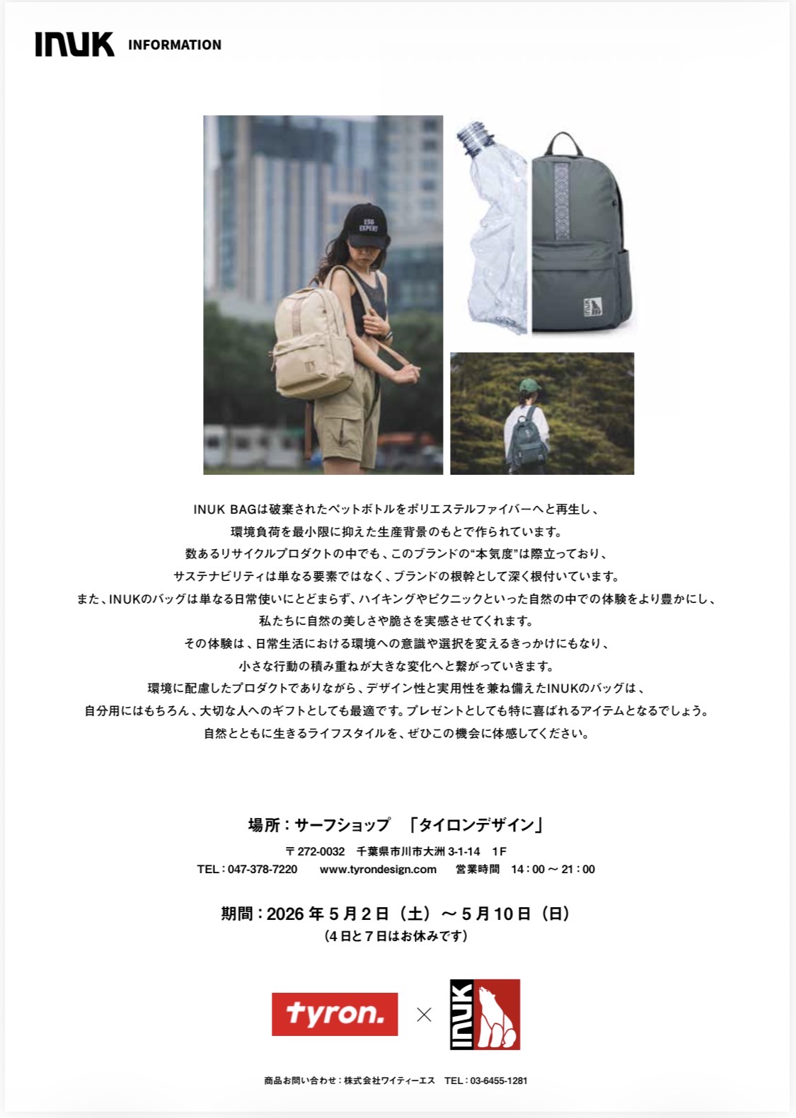 2026年4月22日 / 最終更新日 : 2026年4月22日 tyron ALL INUK x TYRON ポップアップストア開催決定! Tweet Screenshot Screenshot Screenshot INUK X TYRON 5月2日土曜日~5月10日まで 14:00~21:00 日本初のサーフショップでの開催 是非ご来店下さい Follow me! Tweet FacebooktwitterHatenaPocket